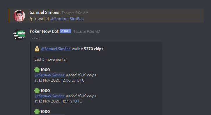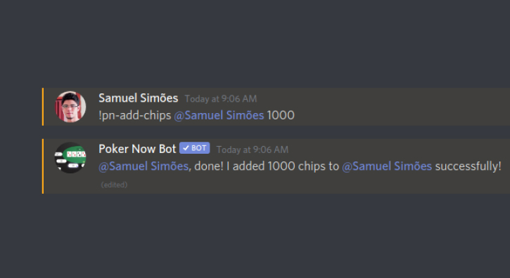 | /chips beg | Beg for chips from the Poker Now Discord Bot, if it is allowed. | |